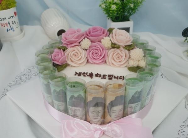 돈 나오는 케이크도 있고 돈 꽃다발도 있고 돈과 관련된 제품이 굉장히 많습니다.