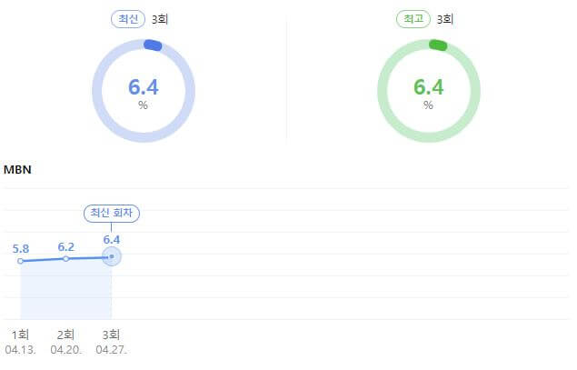 1회 5.8% , 2회 6.2% , 3회 6.4% 로 평균 6%대의 시청률을 보여주고 있습니다.
