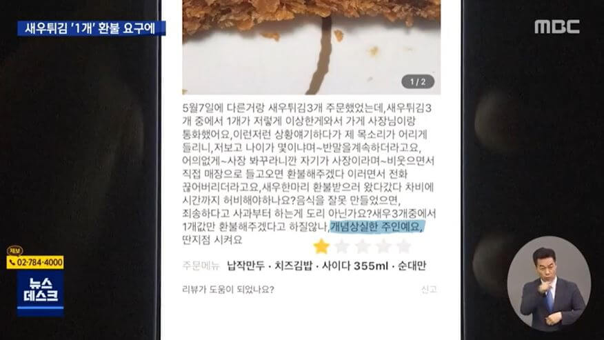 그는 앞서 김밥과 만두, 새우튀김을 시킨 고객으로부터 “주문한 새우튀김 3개 중 1개의 색깔이 이상하다”며 거센 환불 요구를 받았습니다.