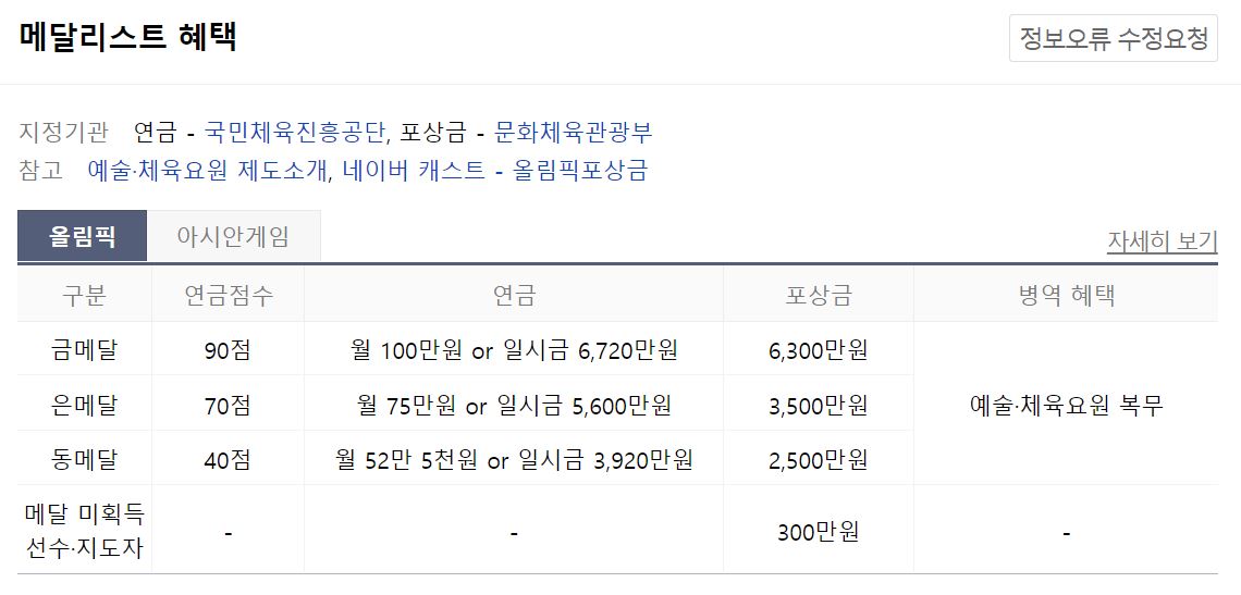 이렇게만 보면 너무 적은거 아니냐 하고 생각하시는 분들이 계실 것 같은데 메달 획득시 금전적 보상은 또 있습니다.