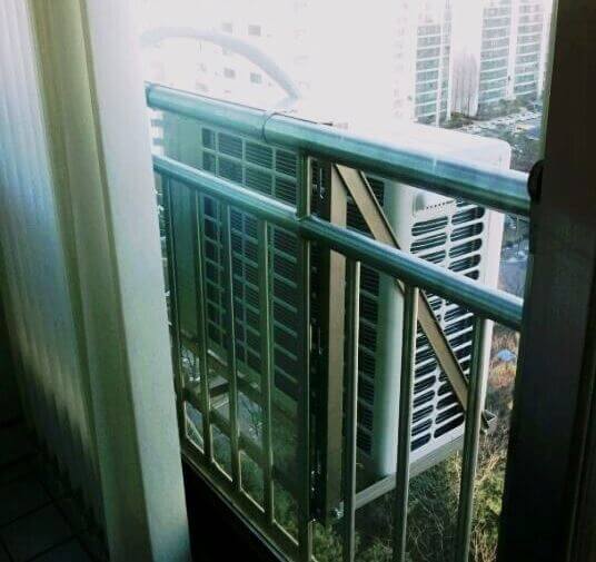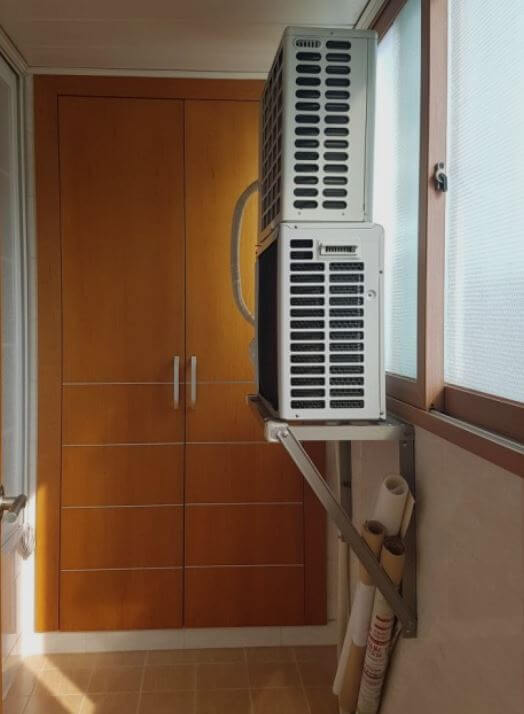 베란다에 설치를 하는데 창문이 높게 달려 있어 어쩔 수 없이 실외기를 높게 설치한 경우입니다.