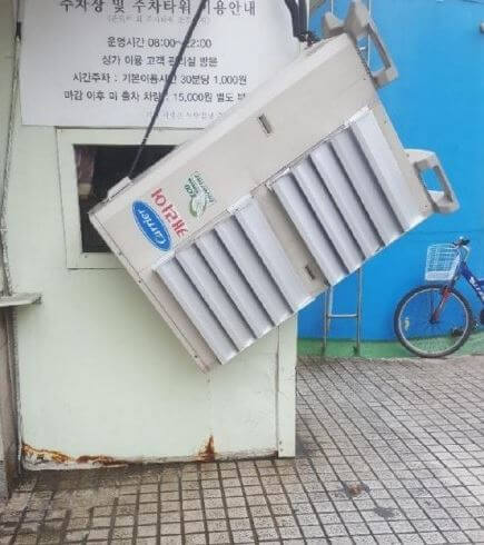외부에 메달아 놓은 것이기 때문에 강풍이나 브라켓의 노후화에 따른 부식으로 실외기가 낙하하는 사고가 종종 발생하기 때문입니다.