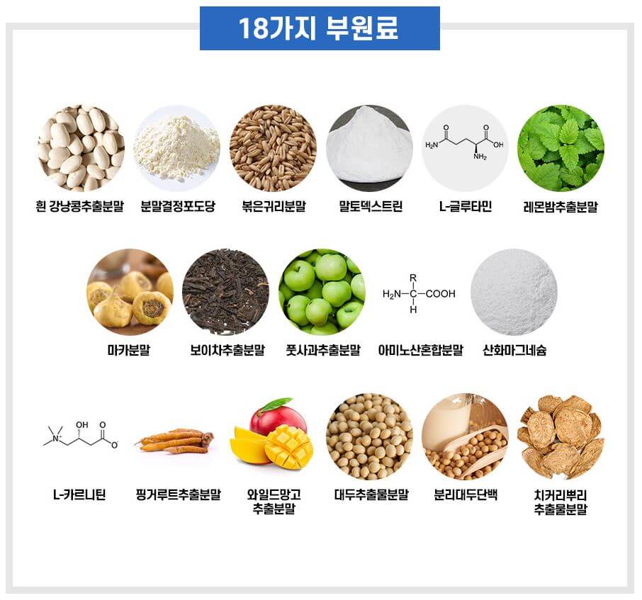 주원료 이외에 18가지의 부원료가 다이어트의 시너지 효과를 내고 있습니다.