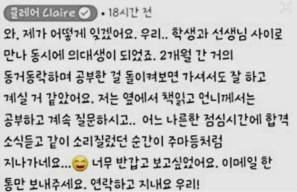 댓글을 단 이는 "2017년에 클레어에게 과외를 받았다면서 덕분에 지방 의대에 합격했다며 이도원에 대한 논란은 사실이 아니라고 주장했습니다."