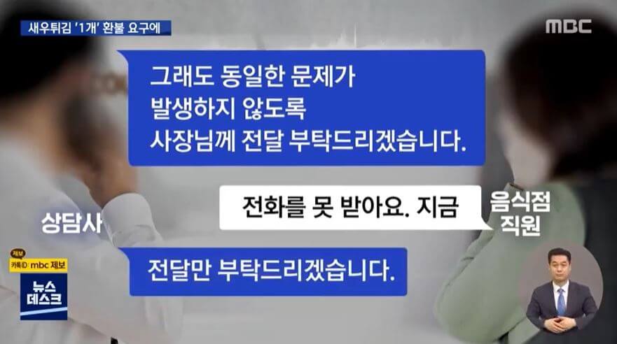 그는 앞서 김밥과 만두, 새우튀김을 시킨 고객으로부터 “주문한 새우튀김 3개 중 1개의 색깔이 이상하다”며 거센 환불 요구를 받았습니다.