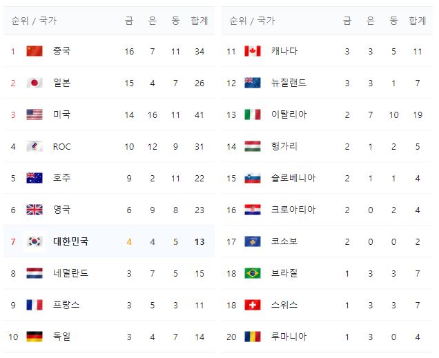 현재 우리나라는 금 4, 은4, 동5 개로 종합순위 7위를 유지하고 있는 중 입니다.