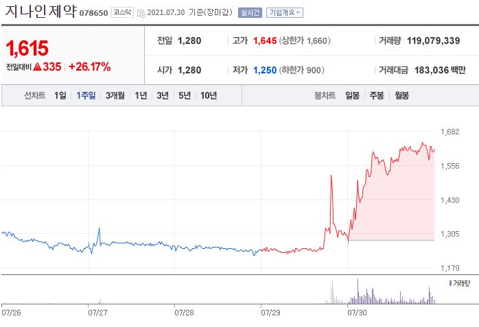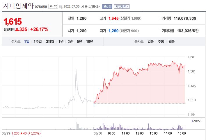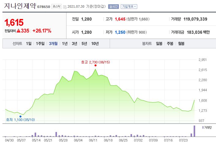 7월 31일 한국거래소에 따르면 전일 지나인제약의 주가는 전 거래일 대비 335원(26.17%) 오른 1615원에 거래를 마쳤다고 합니다.